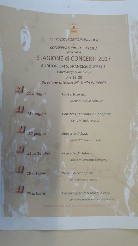 L'Istituto Comprensivo Borgoncini Duca in collaborazione con il Conservatorio di Santa Cecilia oragnizza una serie di concerti presso l'Auditorium San Francesco D'Assisi in piazza Borgoncini Duca 5, ore 18.00. Direzione Artistica del M° Stella Parenti. Primo evento 11 maggiio 2017 "Concerto di Sax". Locandina - Concerto di Sax